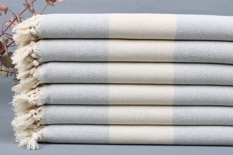 The Turkish towels are crafted from organic Turkish cotton, ensuring a high degree of absorbency and durability. Each towel, blanket, or hand towel is woven from organic Turkish cotton on looms, resulting in a product that is 100% handmade. Characterized by dimensions of 40x70 inches or 100x180 centimeters, the size may vary by ±2 inches or 5 centimeters due to hand weaving. The weight of these towels ranges from 425 to 475 grams.