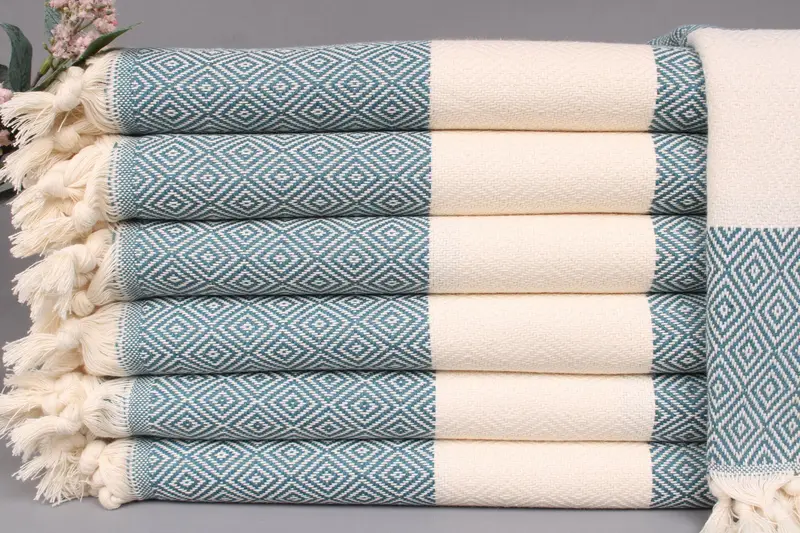 Each bath towel is composed of organic Turkish cotton, ensuring high absorbency and durability. Characterized by its fine weave, the towel features a weight of 420 grams, contributing to its softness and resilience. Dimensions are 40x71 inches or 100x180 centimeters, with a hand-weaving tolerance of ±2 inches or 5 centimeters.