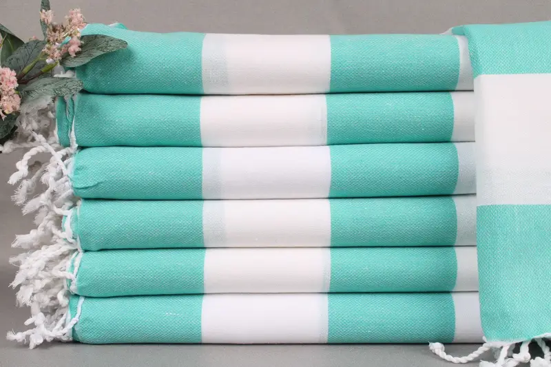 Turkish bath towels are woven from organic Turkish cotton, ensuring high quality and absorbency. Measuring 40x71 inches or 100x180 centimeters and weighing 290 grams, these towels are handmade with weaving tolerances of ± 2 inches or 5 centimeters. Customization options include embroidery, letters, names, or logos, with specific placement and color options available.