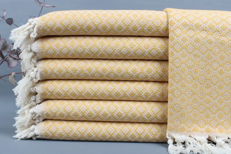 The Turkish hand towel is woven from organic Turkish cotton, ensuring premium quality and soft texture. Characterized by dimensions of 20x38 inches or 50x95 centimeters and weighing 100 grams, each piece exhibits slight variations in size due to hand-weaving tolerances of ±2 inches or 5 centimeters. Personalization options are available through embroidery or printed names, accompanied by specific care instructions for optimal longevity.