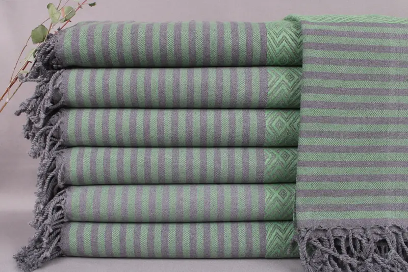 Organic Turkish cotton ensures high absorbency and durability, resulting in a towel that becomes softer with each wash. Characterized by its handmade nature, the Turkish beach towel measures 40x71 inches or 100x180 centimeters and weighs 430 grams, with a hand-weaving tolerance of ±2 inches or 5 centimeters. Customization is available with embroidery or personalization options, offering pre-shrunk status and free global shipping for orders over 35 USD. Wash instructions advise initial separate washing at 30-40 degrees Celsius with low cycles, f...