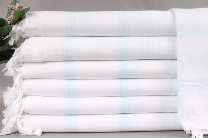 The towels are woven from organic Turkish cotton, ensuring high absorbency and softness. Characterized by a weight of 210 grams, each towel measures 36x71 inches or 90x180 centimeters, with a tolerance of ±2" or 5cm due to hand-weaving.