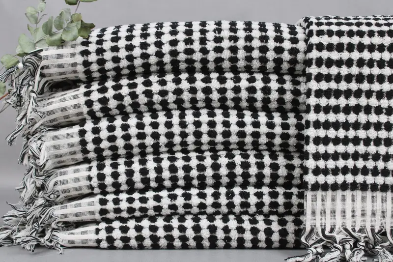 These towels, woven from organic Turkish cotton, are characterized by high absorbency and durability. Resulting in a lightweight yet robust textile, the towels weigh approximately 1060 grams and measure 36x67 inches or 90x170 centimeters, with tolerances of ± 2 inches or 5 centimeters due to hand-weaving. Each item can be personalized with letters, names, or logos, featuring customization options for font, color, and placement.