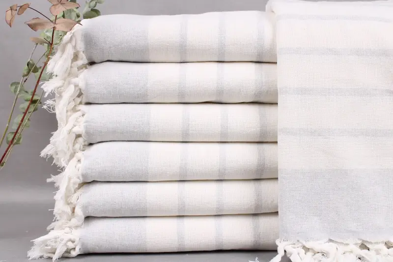 Organic Turkish cotton characterizes the towels, ensuring durability and enhanced absorbency. Measuring 39x67 inches or 98x170 centimeters, the towels weigh 422 grams. Weaving tolerances are within ±2 inches or 5 centimeters.