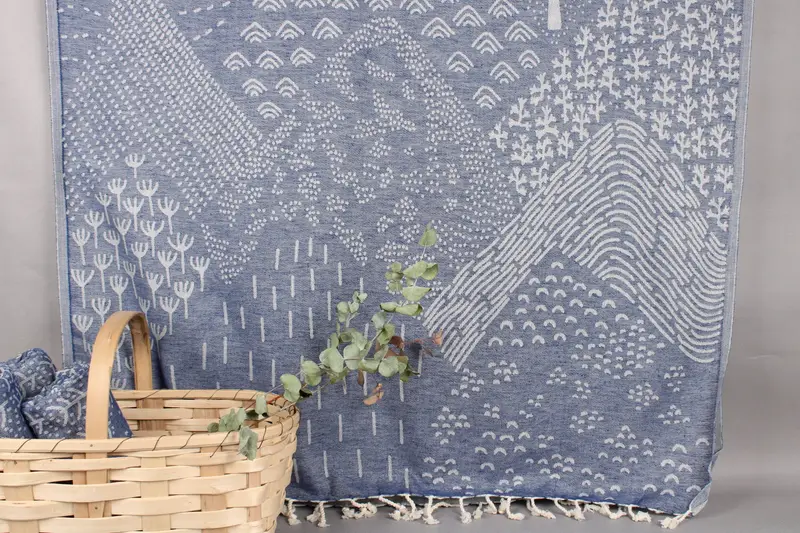 The towels are woven from organic Turkish cotton, ensuring high quality and sustainability. Characterized by their soft texture and durability, these towels are woven by hand on looms resulting in a 260 grams weight per unit. The dimensions are 40x71 inches or 100x180 centimeters with a tolerance of ± 2 inches or 5 centimeters due to the hand-weaving process.