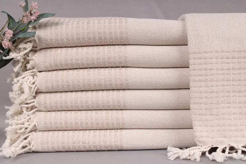 Organic Turkish cotton ensures durability and high absorbency for the Turkish beach towels, resulting in a lightweight yet robust product. Measuring 36x69 inches or 90x175 centimeters with a tolerance of ± 2 inches or 5 centimeters, each towel weighs 420 grams.