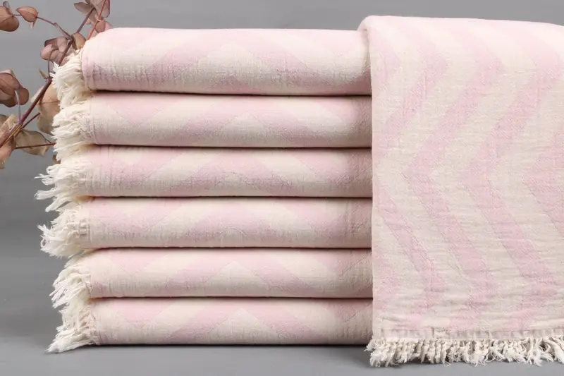 The fiber composition of these towels is derived from organic Turkish cotton, ensuring high quality and superior absorbency. Characterized by their hand-weaving process, the towels exhibit tolerances of ± 2 inches or 5 centimeters. Each piece measures 40x70 inches or 100x180 centimeters, with a weight range of 425-475 grams.