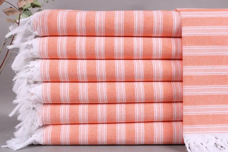 Organic Turkish cotton is utilized in the production of these beach towels, ensuring superior absorbency and softness. Measuring 40x71 inches or 100x180 centimeters, with a weight of 210 grams, these towels are characterized by a weaving tolerance of ±2 inches or 5 centimeters.