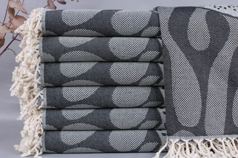 Each towel is woven from organic Turkish cotton, ensuring a high-quality textile that is both soft and absorbent. Characterized by its specific dimensions of 40x71 inches or 100x180 centimeters, these beach towels typically weigh around 450 grams. Due to the hand-weaving process, there may be variations of ± 2 inches or 5 centimeters in size.
