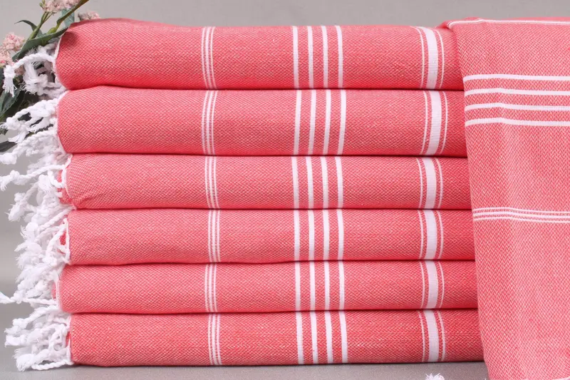 Organic Turkish cotton is utilized in the creation of these beach towels, ensuring superior absorbency and durability. Resulting in a lightweight yet robust textile, these towels weigh 265 grams per piece. Each towel measures precisely 71x40 inches, translating to 180x100 centimeters, with a permissible variance of ±2 inches or 5 centimeters due to manual weaving techniques.