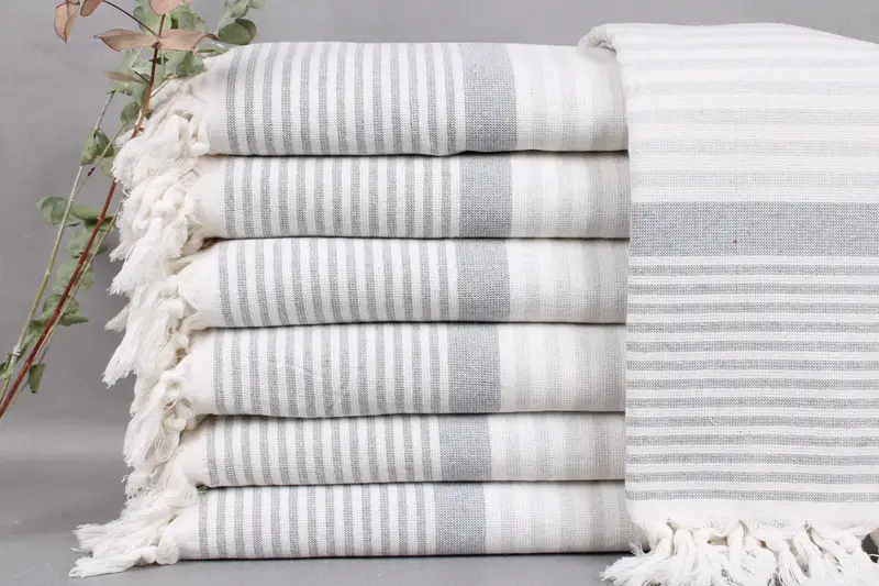 Organic Turkish cotton towels, ensuring superior absorbency and softness. Characterized by hand weaving, each piece measures 38x67 inches or 95x170 centimeters. The weight is 430 grams with tolerances of ± 2 inches or 5 centimeters.