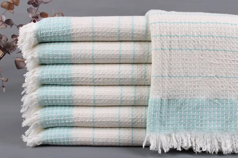 Characterized by its 100% organic Turkish cotton composition, the towels are woven on looms, ensuring a soft and durable texture. Resulting in towels that become softer with each wash, they are advised to be washed separately during the initial few washes. Each towel measures 40x71 inches or 100x180 centimeters, weighing between 425-475 grams with a weaving tolerance of ± 2 inches or 5 centimeters.