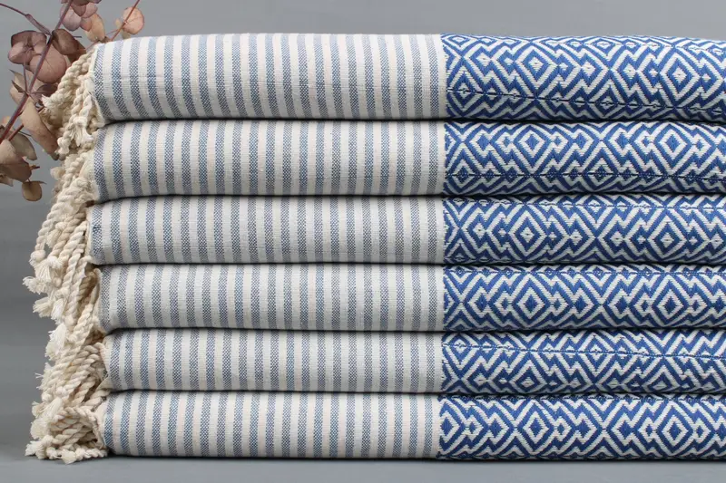 Turkish towels and throws are produced using organic Turkish cotton, ensuring superior absorbency and quality. Characterized by dimensions of 40x70 inches or 100x180 centimeters, these products weigh between 425-475 grams, with weaving tolerances of ± 2 inches or 5 centimeters. Each piece is hand-woven on looms, resulting in slight variations that are inherent to the craft.