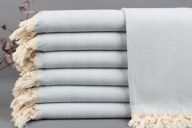 Organic Turkish Cotton Towels ensure superior fiber composition and absorbency. Characterized by a 40x71 inches (100x180 cm) dimension, these towels weigh 300 grams. The towels exhibit a weaving tolerance of ±2 inches (5 cm), resulting in precise dimensions.