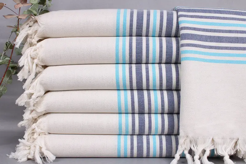Organic Turkish cotton, characterized by its softness and durability, is utilized in these towels, ensuring high absorbency and comfort. Dimensions are 38x71 inches or 95x180 centimeters, with a tolerance of ±2 inches or 5 centimeters due to hand weaving, and a weight of 410 grams. Each product includes customization options with embroidery, offering personalization via letters, names, or logos in specified fonts and colors.