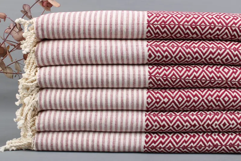 The bath towel is constructed from organic Turkish cotton, ensuring high absorbency and durability. The dimensions are specified as 40x70 inches or 100x180 centimeters, with a permissible size tolerance of ± 2 inches or 5 centimeters due to hand weaving. The weight range is 425-475 grams, providing optimal balance between lightweight comfort and robust material.
