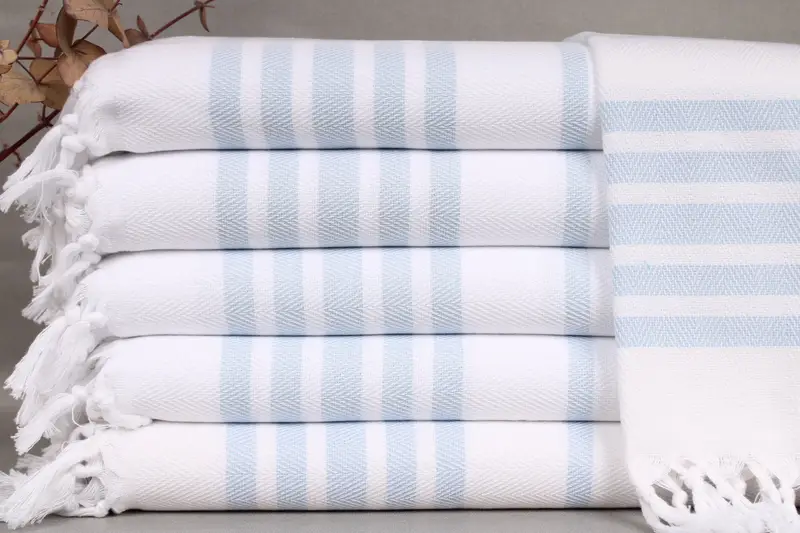 Organic Turkish cotton characterizes these towels, ensuring breathability and absorbency. Each towel, blanket, or hand towel measures 24x36 inches or 60x90 centimeters and weighs 120 grams. Weaving tolerances allow for a size variation of ± 2 inches or 5 centimeters.
