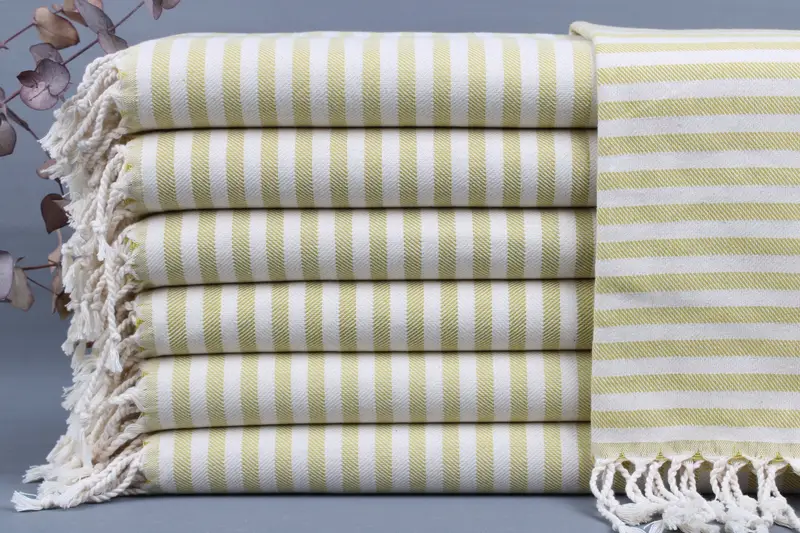 Fiber composition ensures the towels are made from organic Turkish cotton, providing high absorbency and durability. Each towel is woven by hand on looms, measuring 24x40 inches or 60x100 centimeters. The weight of the towels is 130 grams, with weaving tolerances of ±2 inches or 5 centimeters.