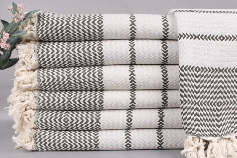 Organic Turkish cotton fibers ensure superior absorbency and durability, making these towels ideal for a variety of uses. Characterized by their soft texture and longevity, these towels are woven by hand on looms, resulting in a uniform and high-quality finish. The dimensions of each towel are 40x79 inches or 100x200 centimeters, with a weight of 460 grams, allowing for a ± 2 inches or 5 centimeters tolerance due to hand-weaving techniques.