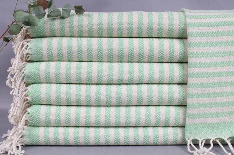 The guest hand towel is composed of organic Turkish cotton, ensuring high absorbency and durability. Resulting in a soft texture, the towel measures 18x40 inches or 45x100 centimeters, with a weight of 115 grams. Each piece is handmade with hand-weaving tolerances of ±2" or 5cm.