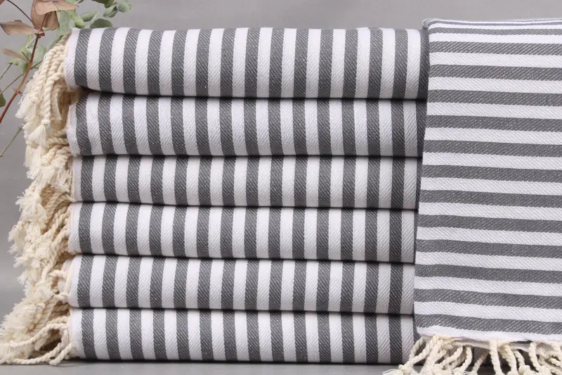 The bath towels, woven from organic Turkish cotton, exhibit high absorbency and durability. Each towel is hand-woven on looms, resulting in dimensions of 40x71 inches or 100x180 centimeters. Characterized by a weight of 298 grams, these towels maintain weaving tolerances of ±2 inches or 5 centimeters.