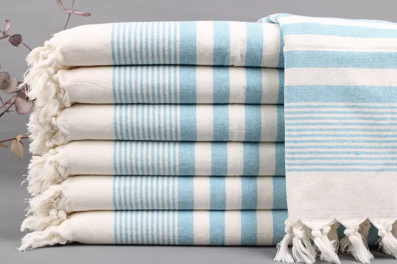 Turkish towels, characterized by their superior absorbency, are woven from organic Turkish cotton, ensuring durability and softness. Dimensions are specified at 18x36 inches or 45x90 centimeters, with a weight of 110 grams. Hand weaving results in a tolerance of ± 2 inches or 5 centimeters in size.