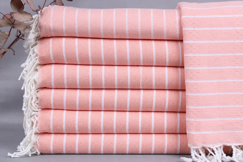 The product features organic Turkish cotton, ensuring superior quality and sustainability. Each towel is meticulously woven by hand on looms, measuring 40x71 inches (100x180 centimeters), with a weight of 300 grams. Variations within ±2 inches (5 centimeters) are permissible due to traditional weaving methods.