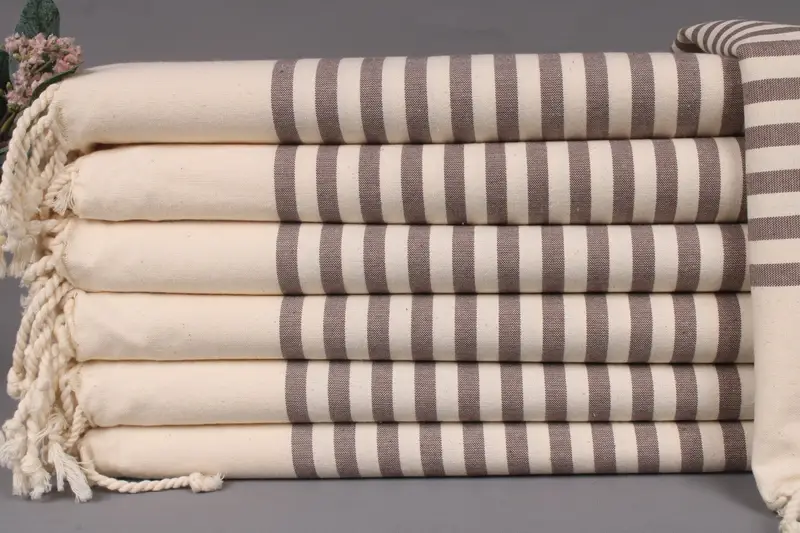 Organic Turkish cotton ensures superior absorbency and texture for beach towels, characterized by gentle hand-weaving on looms. Dimensions are 40x79 inches or 100x200 centimeters, with a weight of 380 grams. Weaving tolerances allow for a ±2" or 5cm variance.