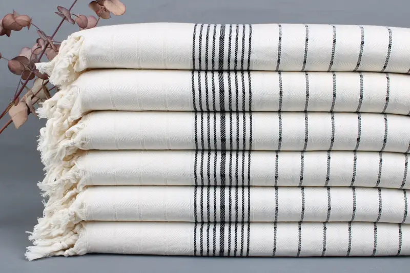 Turkish towels are characterized by their fiber composition of organic Turkish cotton, ensuring superior absorbency and texture. Resulting in towels that measure 40x70 inches or 100x180 centimeters, they weigh between 425-475 grams with hand-weaving tolerances of ±2 inches or 5 centimeters. Each item can be personalized with embroidery or monograms, offering options for letters, logos, and color selection.
