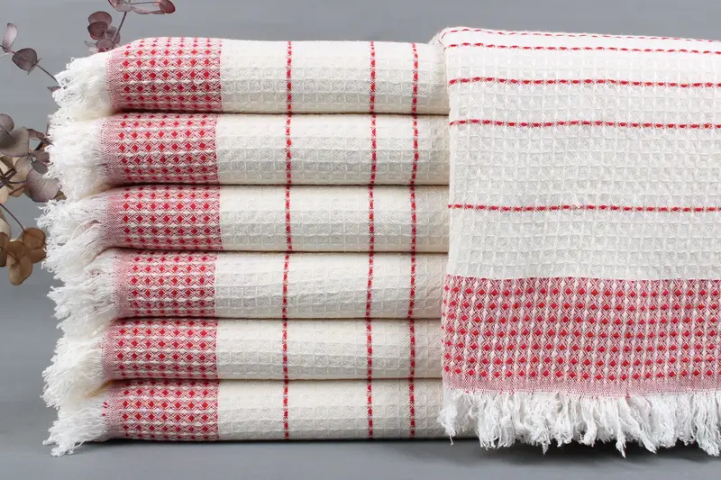 Characterized by their fiber composition, these towels are crafted from organic Turkish cotton, ensuring a premium quality and superior absorbency. Resulting in a soft texture, they are woven on looms, offering a weight range of 425-475 grams. Each towel's dimensions are 40x70 inches or 100x180 centimeters, with a tolerance of ± 2 inches or 5 centimeters due to the hand-weaving process.