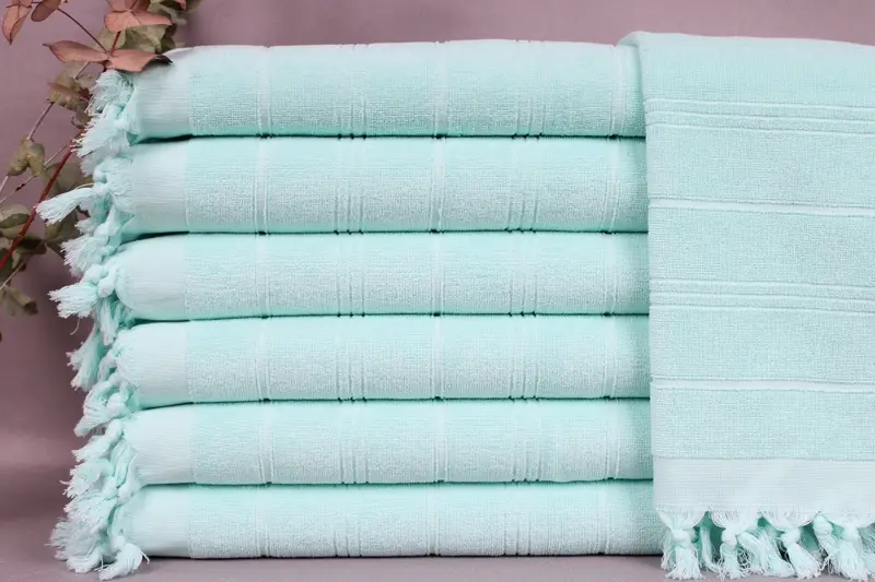 Turkish towels are composed of organic Turkish cotton, ensuring high absorbency and durability. Characterized by their 18x40 inches dimensions or 45x100 centimeters, these towels weigh approximately 115 grams each. Hand-weaving results in a tolerance of ± 2 inches or 5 centimeters.