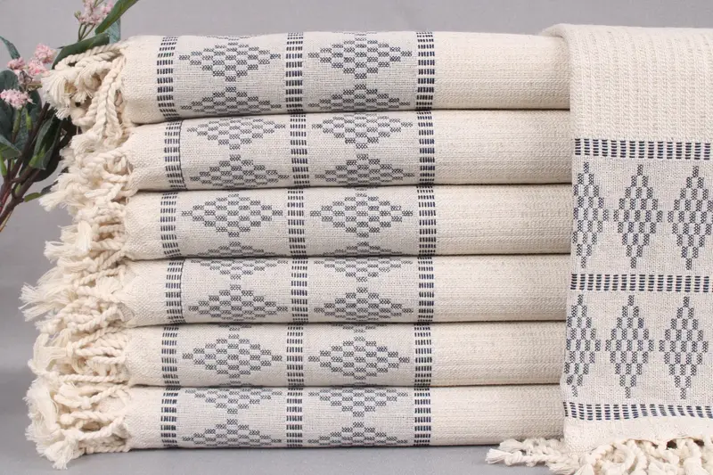 Composed of organic Turkish cotton, these beach towels are characterized by exceptional absorbency. Resulting in a 480 grams weight per piece, they measure 36x71 inches or 90x180 centimeters with a hand-weaving tolerance of ± 2 inches or 5cm. Each listing includes customizable options such as letters, names, or logos, ensuring personalization.