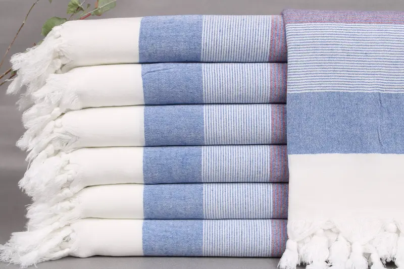 These towels are woven from organic Turkish cotton, ensuring high quality and natural fiber composition. Characterized by their absorbency and durability, these towels are carefully handmade on looms. They measure 40x67 inches or 100x170 centimeters, with a weight of 260 grams. Due to the hand-weaving process, size tolerances may exist up to ±2 inches or 5 centimeters.