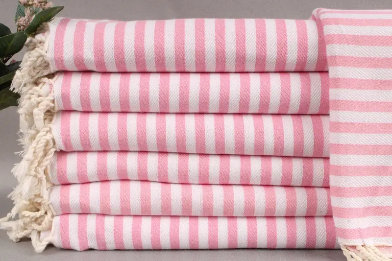 These Turkish beach towels are woven from organic Turkish cotton, ensuring high quality and durability. The towels are hand-woven on looms, resulting in dimensions of 40x71 inches or 100x180 centimeters, with a tolerance of ±2 inches or 5 centimeters due to weaving techniques. Each towel weighs approximately 280 grams and benefits from being pre-shrunk, enhancing its usability and longevity.