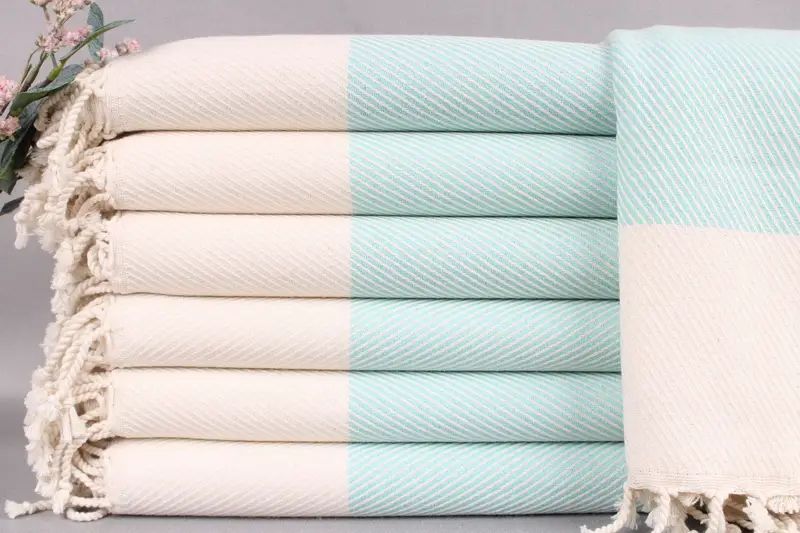 Woven from organic Turkish cotton, these beach towels exhibit superior absorbency and durability. Resulting in a lightweight yet robust texture, they are characterized by their capacity to handle high moisture levels while maintaining a soft feel. Each towel has dimensions of 40x71 inches or 100x180 centimeters, with a weight of 430 grams, and may vary by up to ± 2 inches or 5 centimeters due to the weaving process.