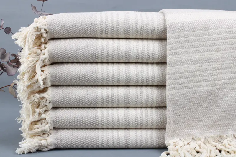 The Turkish beach towel, characterized by its absorbency and softness, is woven from organic Turkish cotton. Each piece measures 40x71 inches or 100x180 centimeters, weighing approximately 420 grams. The size tolerance is ± 2 inches or 5 centimeters due to hand weaving.
