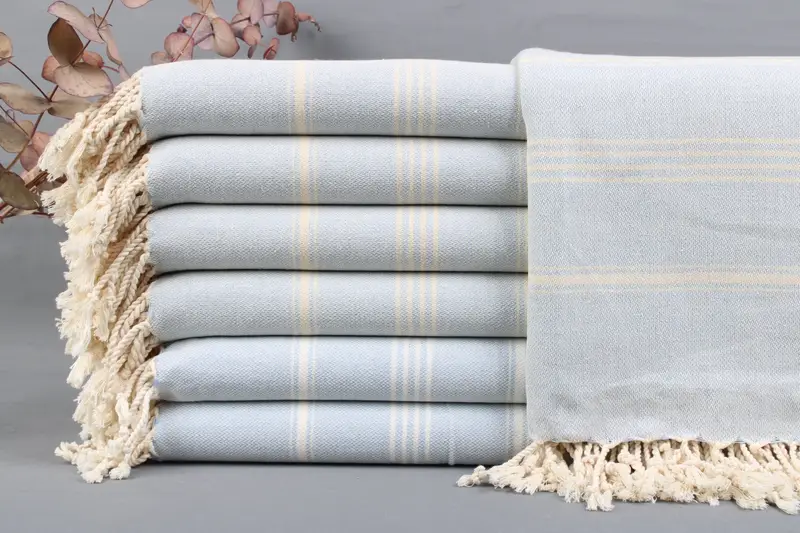 The Turkish towels, including beach towels and bedspreads, are woven from Organic Turkish Cotton. This ensures absorbency and durability, resulting in a highly functional textile. Characterized by dimensions of 40x70 inches (100x180 centimeters) and a weight range of 425-475 grams, these towels allow for a weaving tolerance of ± 2 inches or 5 centimeters. Each towel can be personalized with embroidery or monograms, as specified by the buyer.