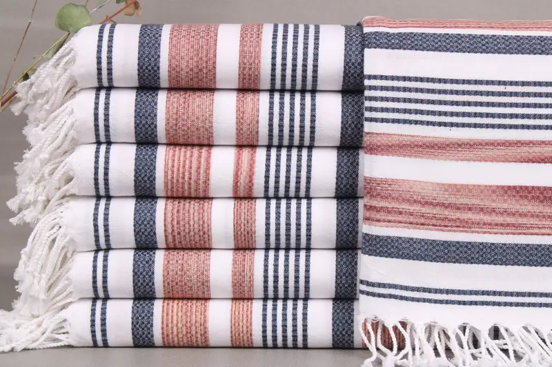 The Turkish beach towels are woven from organic Turkish cotton, ensuring exceptional quality and absorbency. Each piece measures 36x71 inches or 90x180 centimeters and weighs 306 grams, with a hand-weaving tolerance of ± 2 inches or 5 centimeters. This results in a durable, soft, and versatile towel suitable for various applications.
