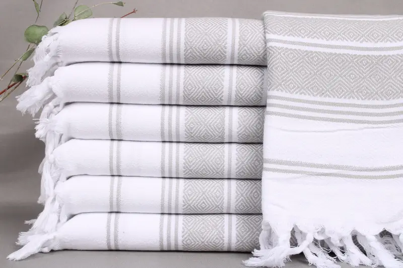 Organic Turkish cotton characterizes these towels, ensuring high absorbency and softness. Each piece, including the personalized towels, measures 18x40 inches (45x100 cm) and weighs 110 grams. Size tolerances may vary by up to 2 inches (5 cm) due to manual weaving.
