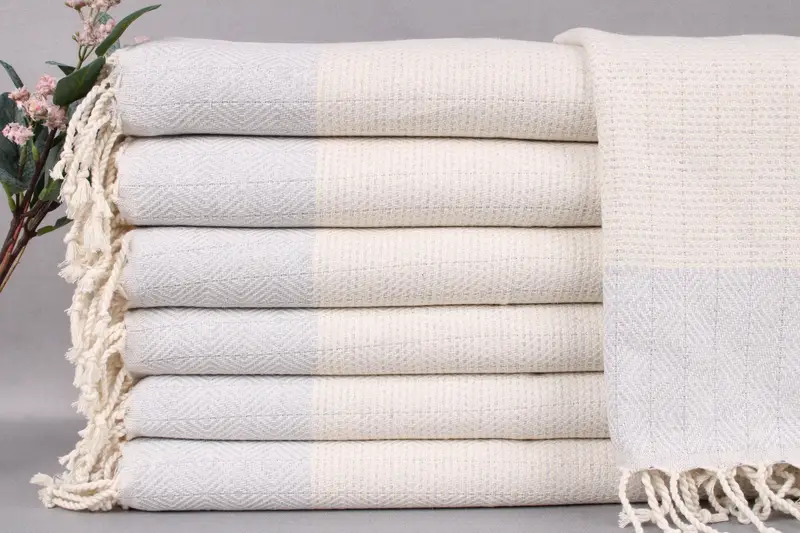Composed of organic Turkish cotton, these towels exhibit superior absorbency and softness. The fibers ensure optimal moisture retention, resulting in a plush feel post-wash. Characterized by a hand-weaving process, each towel features dimensions of 18x36 inches or 45x90 centimeters. The weight of each towel is precisely 122 grams, with size tolerances of ± 2 inches or 5 centimeters due to the weaving technique.