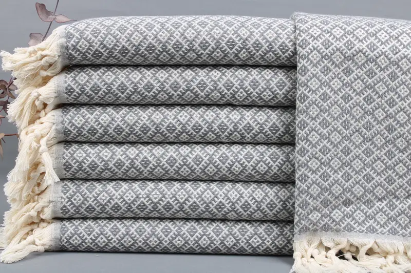 These towels, categorized under wedding gifts and bath decor, are woven from organic Turkish cotton, ensuring high quality and durability. Resulting in optimal absorbency, each piece measures 20x38 inches or 50x95 centimeters, with a weight of 100 grams. Weaving tolerances may result in size variations of ±2 inches or 5 centimeters.