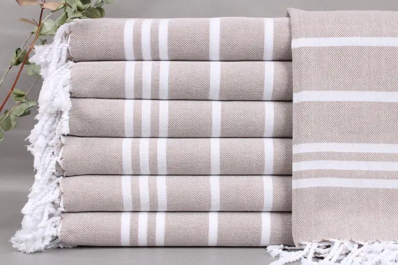 The towels are woven from organic Turkish cotton, ensuring high absorbency and softness. Characterized by dimensions of 40x71 inches or 100x180 centimeters, the weight of each piece is 440 grams with a weaving tolerance of ±2 inches or 5 centimeters.