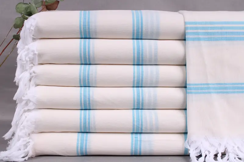 Organic Turkish cotton characterizes the towels, resulting in high absorbency and durability. The towels, sized at 40x71 inches or 100x180 centimeters, have a tolerance of ± 2 inches or 5 centimeters. Weighing 310 grams, each piece is handmade, ensuring a unique finish.