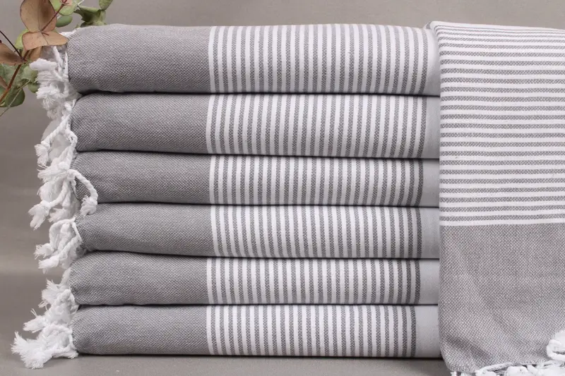 Turkish towels are characterized by their organic Turkish cotton composition, ensuring superior absorbency and durability. Each towel measures 40x71 inches or 100x180 centimeters, weighing 300 grams with a tolerance of ± 2 inches or 5 centimeters due to hand-weaving. All items are pre-shrunk and require a wash before first usage to enhance softness.