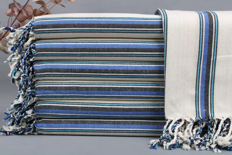 The bath towel is woven from organic Turkish cotton, ensuring superior absorbency and durability. Each item, including beach towels, small towels, and throws, is handmade with precision on looms, resulting in dimensions of 40x70 inches or 100x180 centimeters. A tolerance of ± 2 inches or 5 cm in size is expected due to weaving.