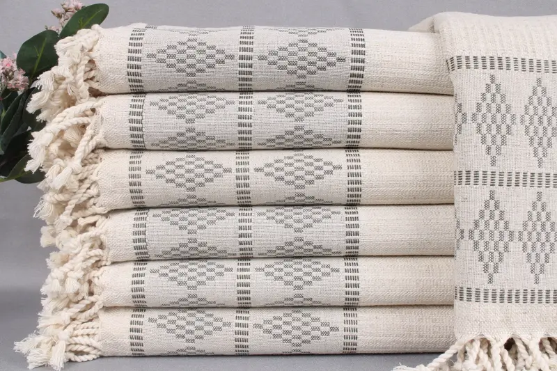 The Turkish beach towels are composed of organic Turkish cotton, ensuring high absorbency and durability. Characterized by their artisanal hand-weaving, these towels measure 36x71 inches (90x180 centimeters) with a tolerance of ± 2 inches (5 centimeters). Weighing 480 grams, they offer substantial comfort for multiple uses.