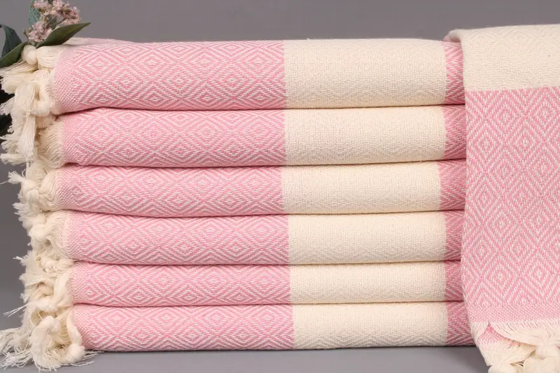 Turkish Towels are woven from organic Turkish cotton, ensuring a premium texture and high absorbency. Resulting in each towel weighing 420 grams and measuring 40x71 inches or 100x180 centimeters, they exhibit a tolerance of ± 2" or 5 cm in size due to hand-weaving. Each listing offers customization options for embroidery, letters, or logos, with a recommended placement at the middle of the bottom for aesthetic consistency.