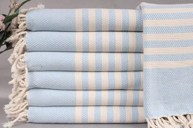 Organic Turkish cotton is utilized, ensuring durability and high absorbency for each towel. Resulting in a weight of 380 grams, the towels measure 40x67 inches or 100x170 centimeters with a tolerance of ± 2 inches or 5 centimeters due to hand-weaving. Towels, hand towels, and blankets are all customizable with embroidery, names, or logos, including detailed placement and font preferences.