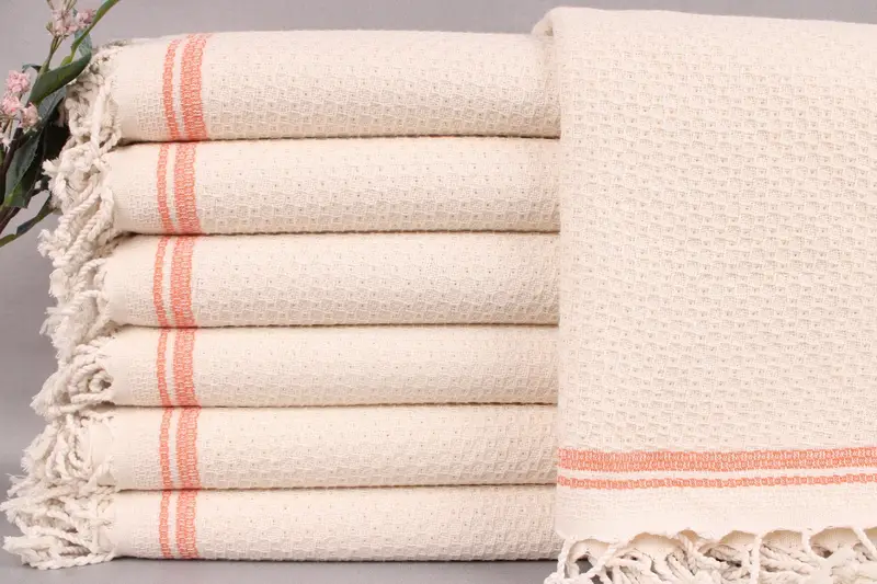 Organic Turkish cotton, recognized for its superior absorbency, is the material utilized in the production of these beach towels, bedspreads, and blankets. The towels are woven by hand on looms, resulting in a robust yet soft texture that enhances over multiple washes. Characterized by dimensions of 67x36 inches or 170x90 centimeters, each piece weighs 440 grams with a permissible size tolerance of ±2 inches or 5 centimeters due to the hand-weaving process.