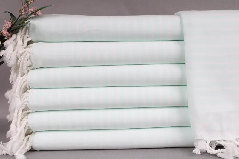The product is characterized by its woven construction from organic Turkish cotton, ensuring breathability and durability. Each towel measures 40x71 inches or 100x180 centimeters, with a weight of 260 grams, resulting in a comfortable yet sturdy textile. The hand-weaving process allows for a tolerance of ± 2 inches or 5 centimeters in size, maintaining consistency across batches.